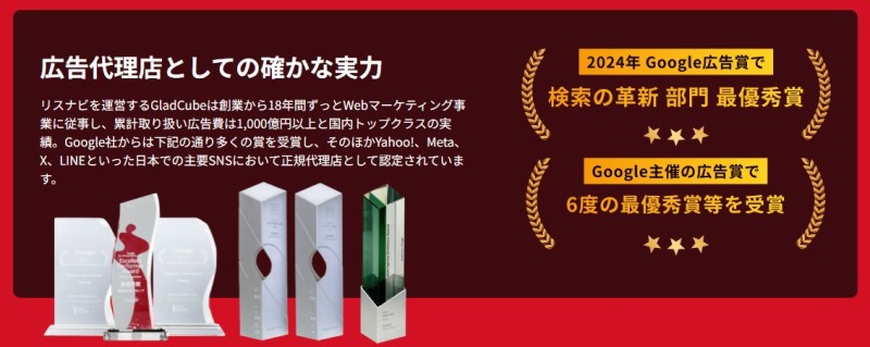 グラッドキューブはGoogle、Yahoo!、Meta、X、LINEなど主要メディアの正規代理店として認定され、Google主催の広告賞で6度の受賞実績があります。