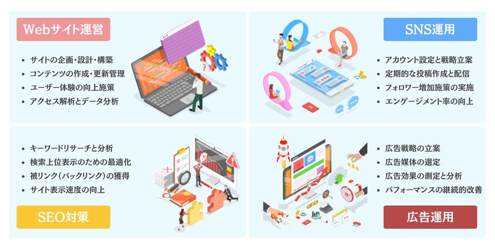 Webマーケティングとは、インターネットを活用して企業や個人の集客・販売促進を支援する仕事です。